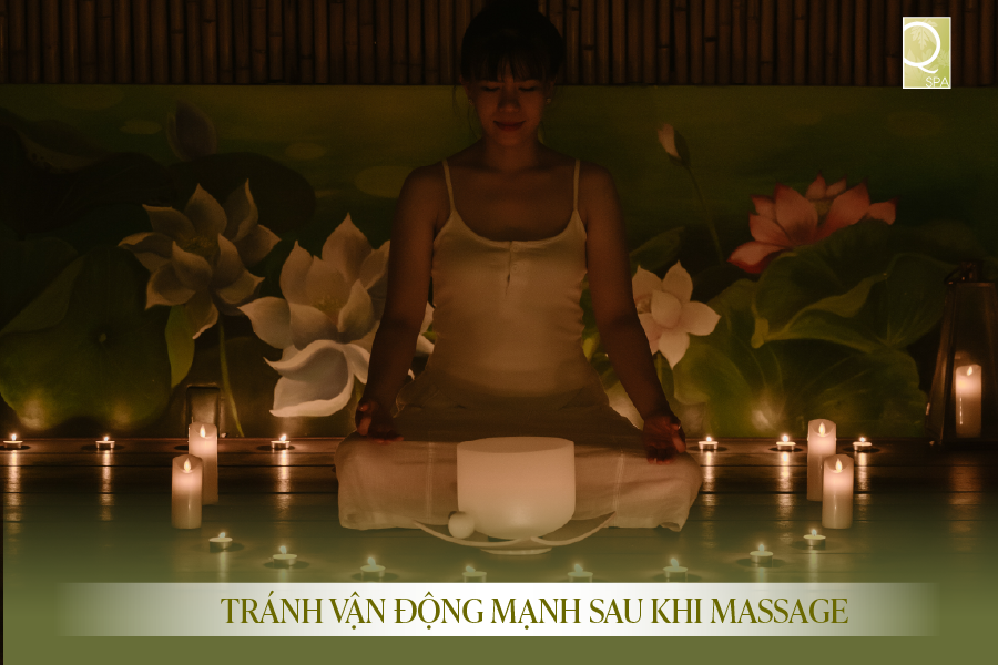 Không nên vận động mạnh hoặc làm việc nặng ngay sau khi massage, bởi lẽ, lúc này các cơ và hệ thống tuần hoàn của cơ thể vẫn còn trong trạng thái đang phục hồi và thư giãn. Vận động mạnh hoặc làm các công việc đòi hỏi nhiều sức lực có thể phá vỡ trạng thái này, gây ra các tổn thương hoặc làm giảm hiệu quả của quá trình thư giãn.